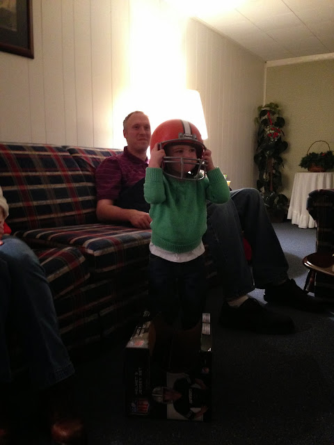 X loved the football helmet my little cousin had when we saw him last time! They decided to give him his own Browns helmet & jersey :) He loved wearing it around while opening presents!